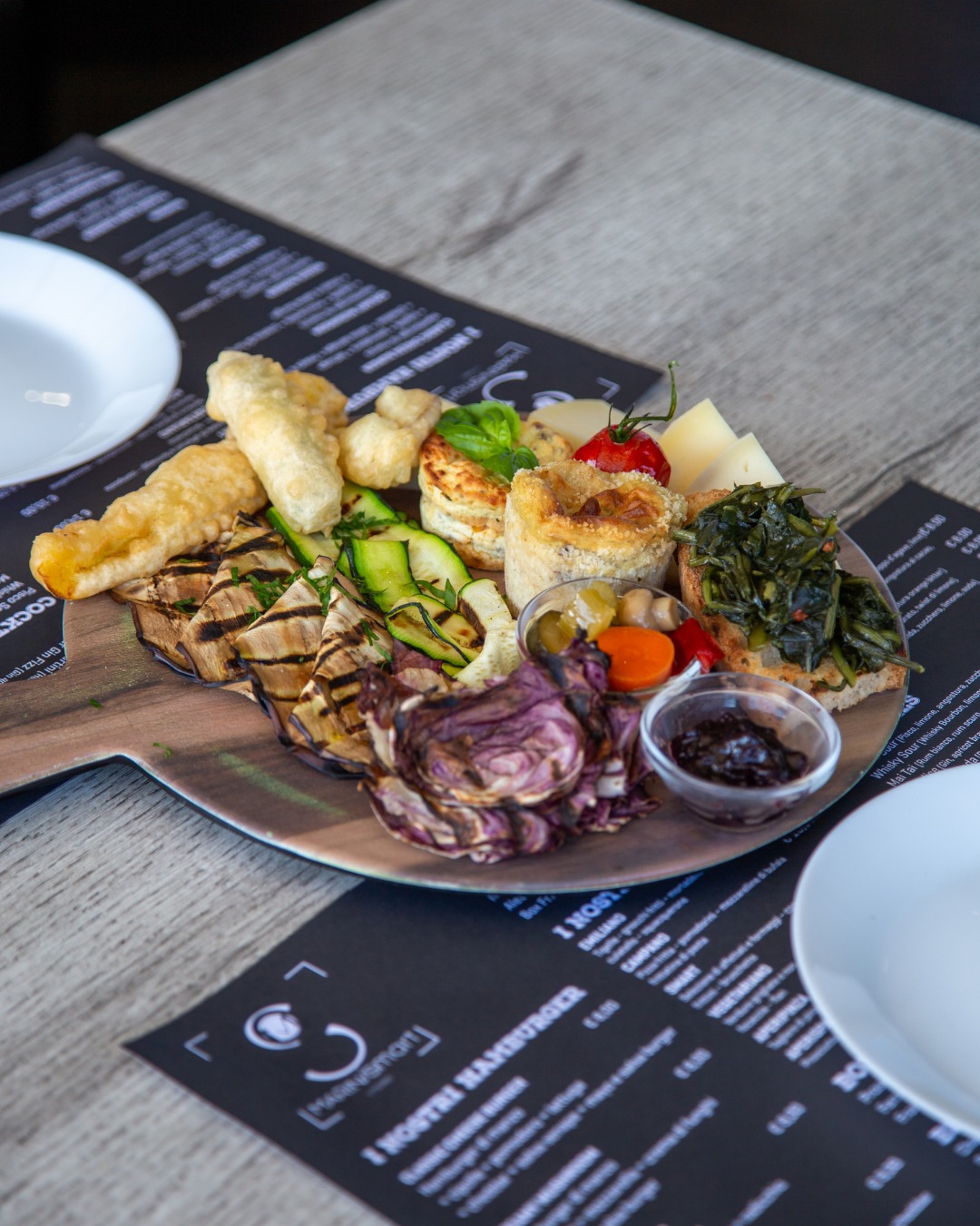 Affettati tipici locali, ricottina al pistacchio, carciofo grigliato, bruschette al lardo, olive piccanti, i nostri formaggi, verdurine e sfizi della casa