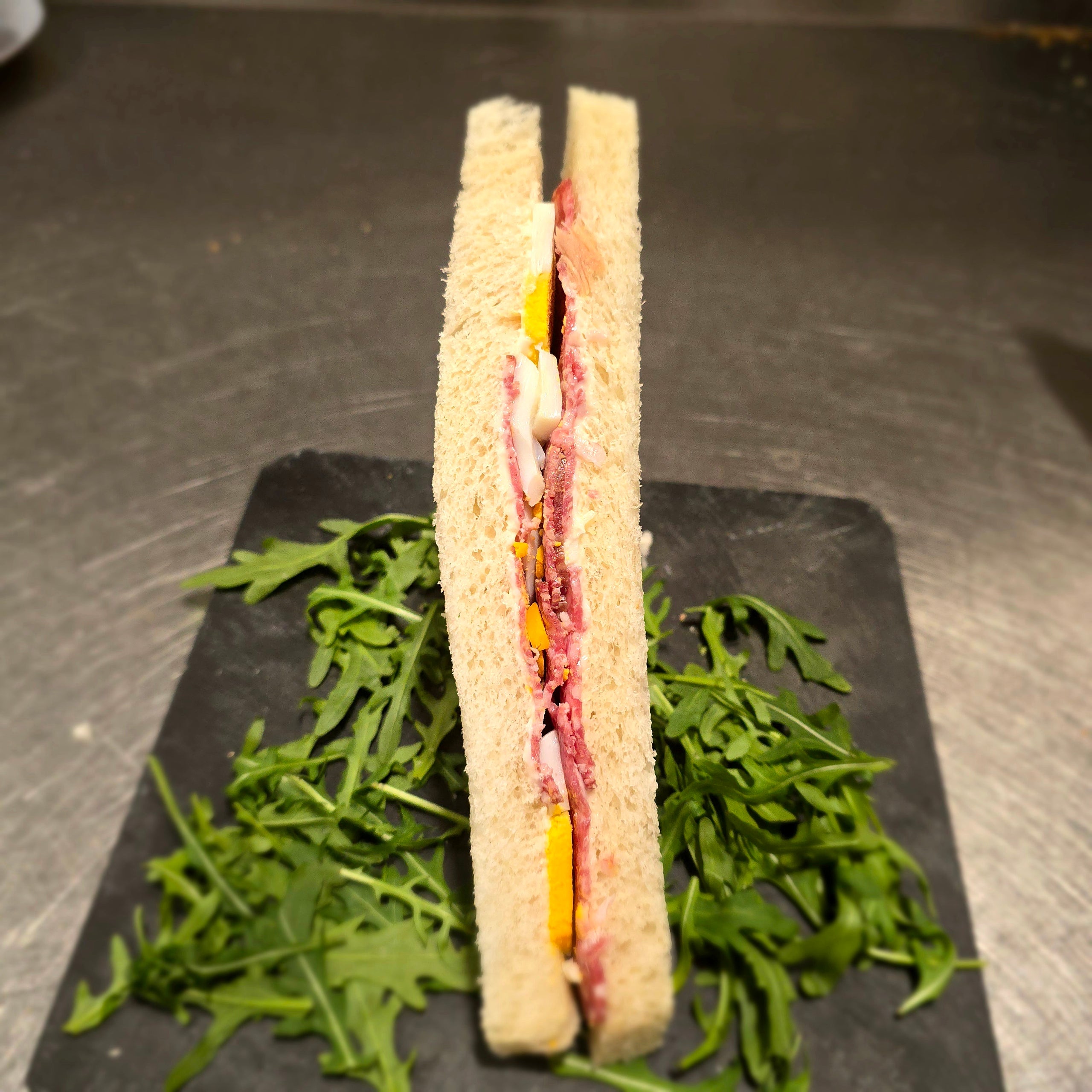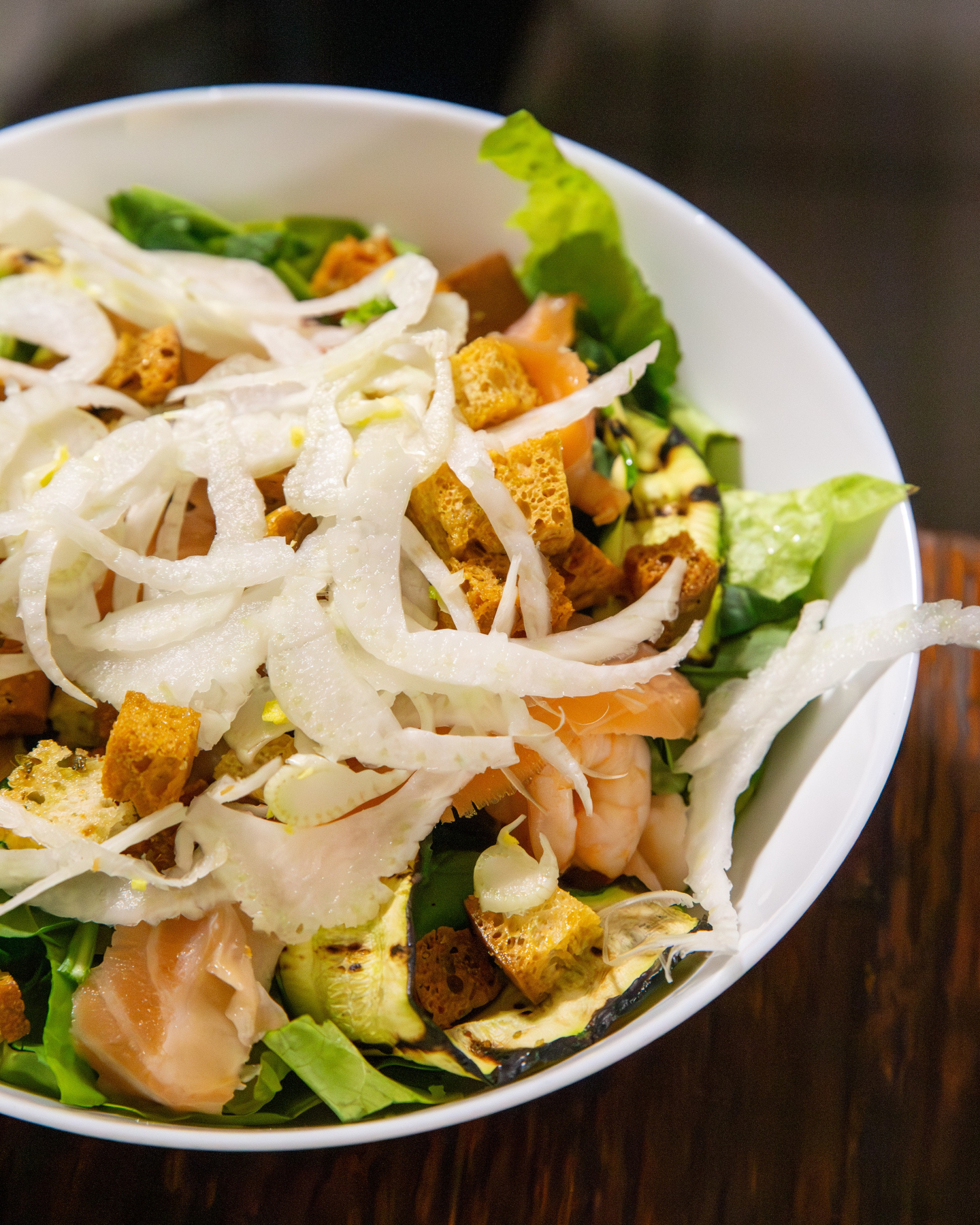 Lattuga, rucola, finocchio, salmone affumicato, gamberetti, zucchine grigliate, crostini di pane